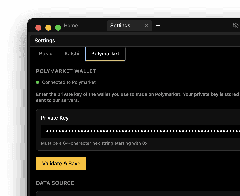 Link your Kalshi and Polymarket accounts with API keys. Your credentials never leave your device.